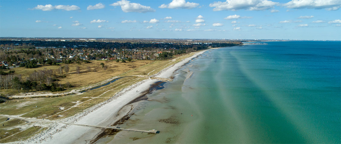 der bugter sig langs den lækre, brede sandstrand med klitter og badebroer. Her er du tæt på